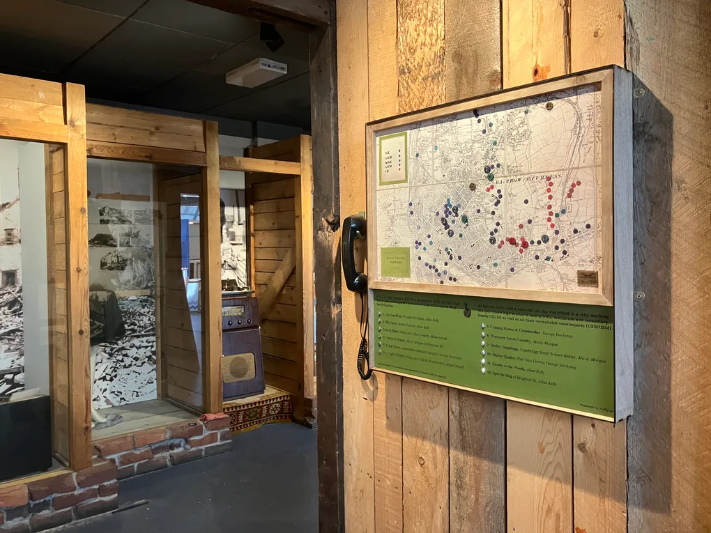 The original Blitz display includes the set of a bombed-out house complete with mannequins. We added some digital enhancements here with the Museum’s collection of Blitz photos subtly colorised and presented in a scrolling display. Projection-mapping software was adapted to make these appear in a gap in the wall, as if showing the damaged street beyond (pleasingly the young lad mannequin who was already gazing at the wall, now has something new to look at). The Artfly laser cutter was also put to good use cutting a street sign prop, so the location of each photo is simultaneously projected onto this, now dynamic sign.